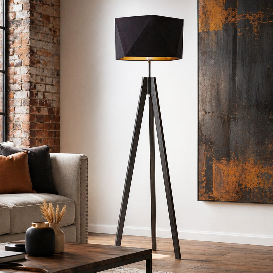 Drewniana lampa stojąca do sypialni LAGOS GOLD to nowoczesne oświetlenie, które efektownie ozdobi i rozpromieni Twoje wnętrze. Ta stylowa lampa podłogowa drewniana na trójnogu o wysokości 144 cm, wyposażona w diamentowy abażur o przekątnej 45 cm, została zaprojektowana z myślą o przestrzeniach wypoczynkowych, takich jak sypialnia czy salon.