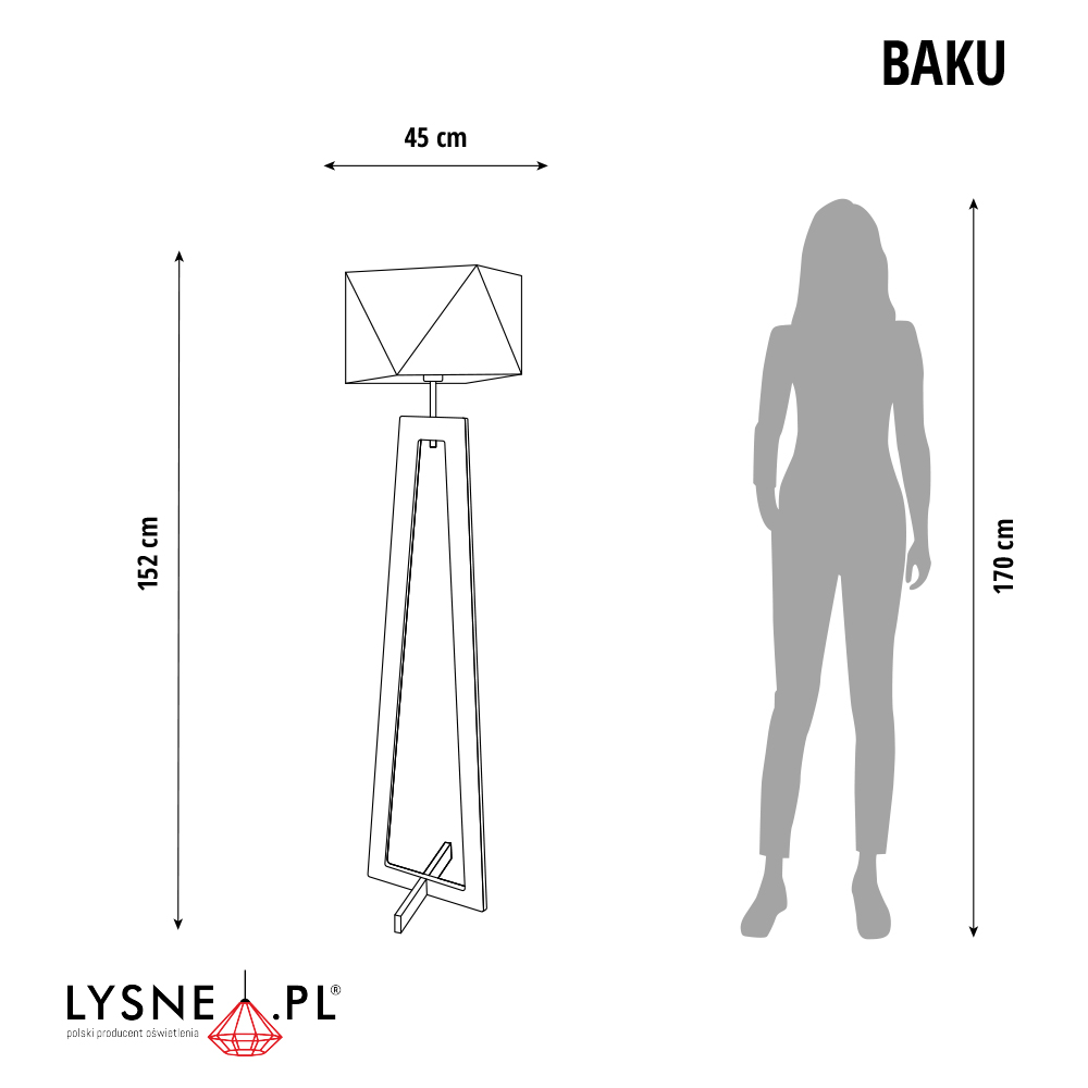 BAKU — lampa stojąca drewniana z abażurem to definicja nowoczesnej sztuki projektowania oświetlenia z nutą klasycznego designu. Wydana pod szyldem częstochowskiej marki LYSNE.PL lampa podłogowa składa się z foremnych nóg z drewna sosnowego i tkaninowego, wielowymiarowego abażura. Elegancka drewniana konstrukcja lampy została wzmocniona poprzecznym elementem, który nadaje jej stabilności. BAKU ma 152 cm wysokości i 45 cm szerokości, równej przekątnej abażura. Zarówno kolor klosza (biały, ecru, jasny szary (gołębi), miętowy, musztardowy, jasny różowy, jasny fioletowy, beżowy, szary (stalowy), czerwony, niebieski, fioletowy, zieleń butelkowa, granatowy, grafitowy, brązowy, czarny oraz szary melanż (tzw. beton)), jak i zabarwienie drewnianego stelaża (biały, popielaty, dąb, mahoń, heban) możesz dowolnie konfigurować, dopasowując do własnych potrzeb. Drewniana lampa podłogowa z abażurem ma miejsce na jedną żarówkę z tzw. dużym gwintem E27 — LED lub o klasach energetycznych od A do G i maksymalnej mocy 60 W. Nowoczesna lampa stojąca z drewna BAKU posiada unijny certyfikat zgodności CE i 24-miesięczną gwarancję.