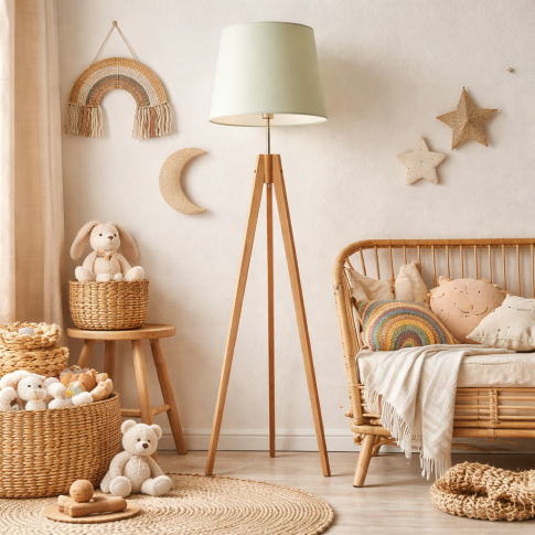 Abażur w kształcie stożka wykonany został z holenderskiej tkaniny tekstylnej podklejonej na białej lub bezbarwnej folii PVC (w przypadku koloru betonowego), natomiast stelaż to naturalne drewno sosnowe. Niezaprzeczalną zaletą tej lampy stojącej z drewna jest wybór koloru abażuru spośród kilkunastu wariantów kolorystycznych oraz 5 kolorów drewna (białego, popielatego, dębowego, mahoniowego oraz hebanowego). Lampę stojącą na trójnogu docenią miłośnicy prostych form i oszczędnego stylu.