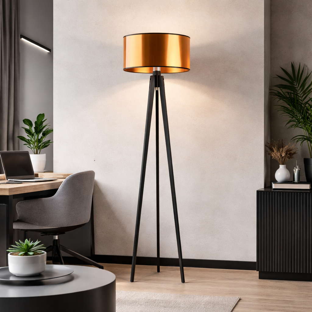 Lampa stojąca na trójnogu MIAMI MIRROR to idealna propozycja dla miłośników natury jak i nowoczesnych rozwiązań. Do produkcji stelaża lampy podłogowej wykorzystano odnawialny surowiec w postaci drewna sosnowego zaś abażur o średnicy 40 cm to designersko prezentujący się materiał PVC dostępny w dwóch wariantach kolorystycznych. Czarne lampy podłogowe z miedzianymi elementami są niezwykle pożądane jako dodatkowy akcent wystroju wnętrz w stylu nowoczesnym, industrialnym czy nawet glamour. Klosze wykonane są z wysokogatunkowej, holenderskiej tkaniny PVC o fakturze przypominającej taflę lustra – całość prezentuje się niezwykle stylowo i nowocześnie. Abażur przebija światło uwydatniając główny punkt świetlny. Blask żarówek emitowany jest równomiernie w górę i w dół rozpraszając światło w formie subtelnej acz mocnej poświaty.