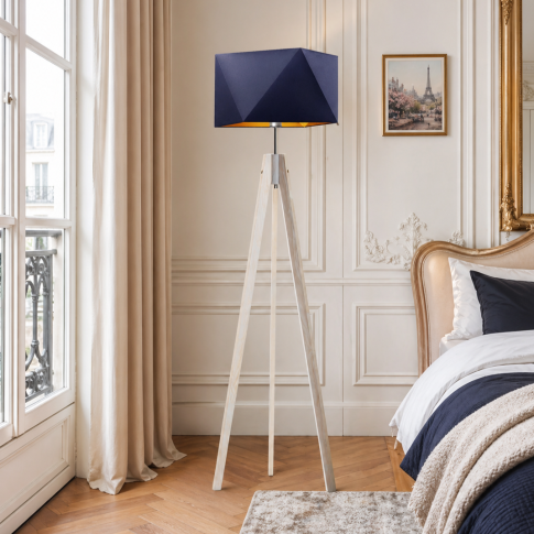 Drewniana lampa stojąca do sypialni LAGOS GOLD to nowoczesne oświetlenie, które efektownie ozdobi i rozpromieni Twoje wnętrze. Ta stylowa lampa podłogowa drewniana na trójnogu o wysokości 144 cm, wyposażona w diamentowy abażur o przekątnej 45 cm, została zaprojektowana z myślą o przestrzeniach wypoczynkowych, takich jak sypialnia czy salon.