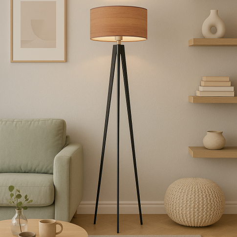 Lampa podłogowa z trójnożną podstawą i abażurem w kolorze orzechowym
