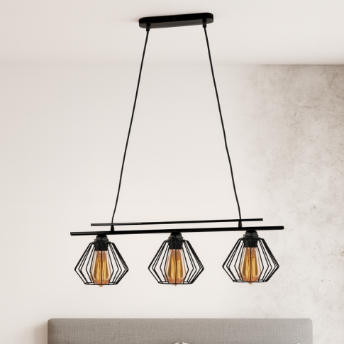 Lampa wisząca w stylu loft TIJUANA mierząca 120 cm i 77 cm szerokości, dzięki geometrycznym kształtom oraz nietypowemu układowi drucianych abażurów, wprawi w zachwyt każdego miłośnika loftowych aranżacji wnętrz. Metalowy stelaż dostępny jest w dwóch wariantach kolorystycznych: białym i czarnym, a industrialne klosze diamenty także w dwóch: białym oraz czarnym. Model ten posiada aż trzy miejsca na źródło światła o klasie energetycznej od A do G oraz LED i doskonale wpasuje się we wnętrza oświetlane pozostałymi propozycjami z kolekcji LOFT.