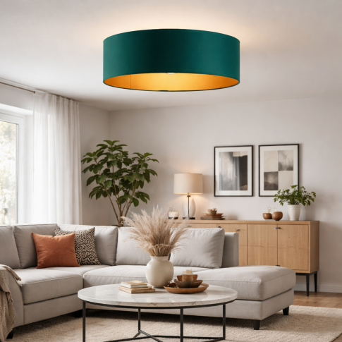 Dzięki możliwości indywidualnego doboru wariantu kolorystycznego abażura (wybór spośród 5 kolorów: biały ze złotym wnętrzem (złoty połysk), szary stalowy ze złotym wnętrzem (złoty mat), zieleń butelkowa ze złotym wnętrzem (złoty mat), granatowy ze złotym wnętrzem (złoty mat) oraz czarny ze złotym wnętrzem (złoty mat)) plafon Medina idealnie sprawdzi się jako główne źródło światła w salonie, sypialni czy stanie się eleganckim elementem dekoracyjnym w restauracji, biurze czy wnętrzu hotelowym.