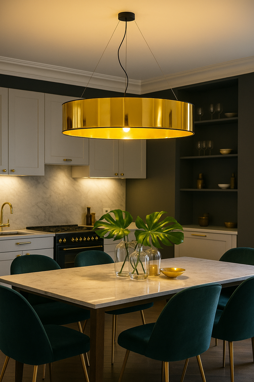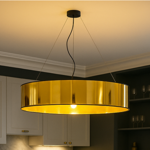 Połączenie czerni i złota nadaje lampie PORTO wyraźnie dekoracyjny charakter, dzięki czemu świetnie odnajduje się w aranżacjach nowoczesnych, loftowych i industrialnych. Ta lampa sufitowa ze złotym abażurem nie tylko przyciąga wzrok, ale również pozwala dopasować intensywność oświetlenia do Twoich potrzeb – dzięki możliwości wyboru 3, 4 lub 5 oprawek E27. To rozwiązanie szczególnie cenione we wnętrzach w których światło ma podkreślać atmosferę, a nie tylko pełnić funkcję praktyczną. Nowoczesna lampa wisząca PORTO bez wysiłku staje się głównym punktem pomieszczenia: zarówno w domowej kuchni jak i w restauracji czy przestrzeni hotelowej.