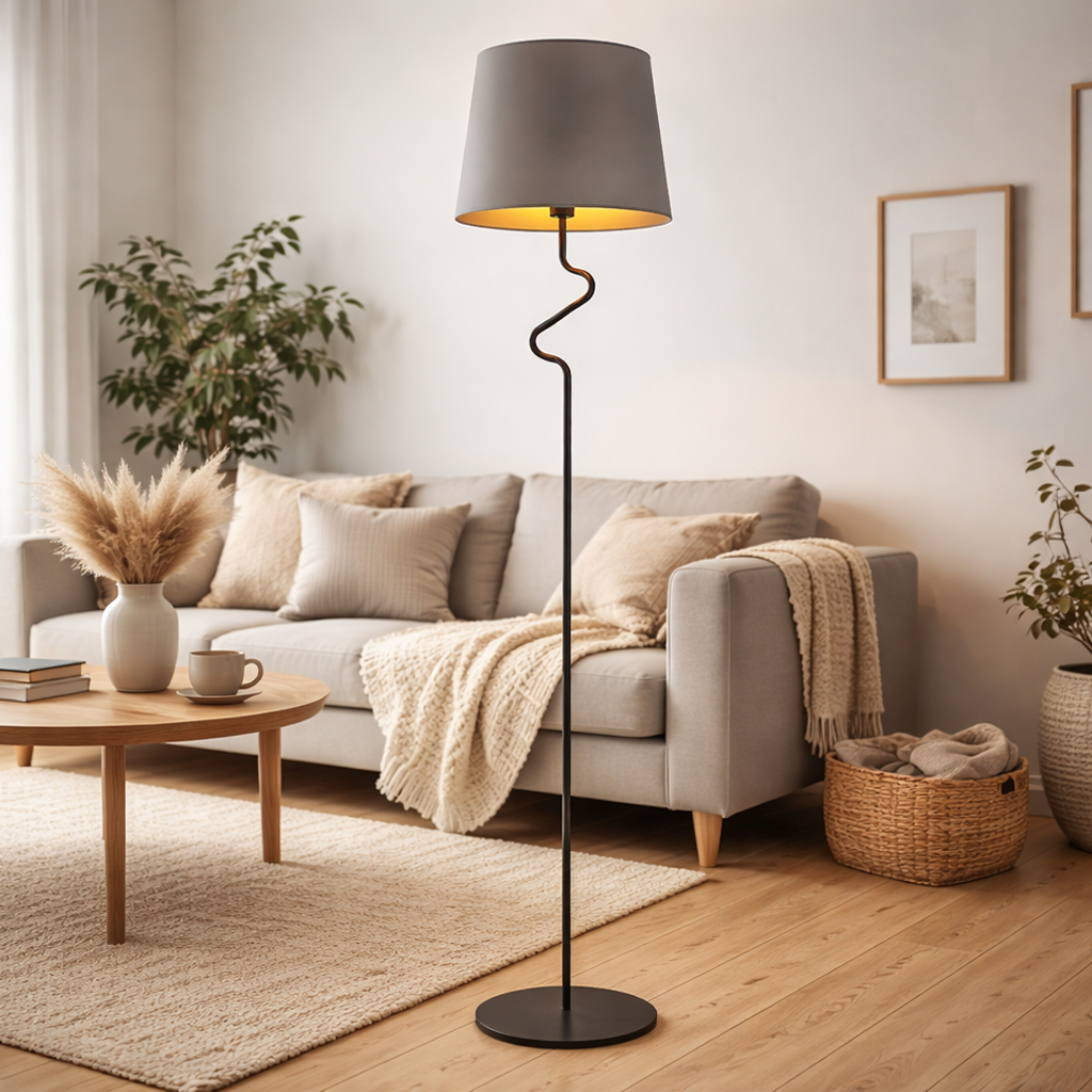 Lampa podłogowa FOGO to elegancki element oświetlenia z kolekcji GOLD zaprojektowany przez renomowaną polską markę LYSNE.PL. Charakteryzuje się wyjątkowym, metalowym stelażem dostępnym w kilku kolorach o unikalnym kształcie, który subtelnie zakrzywia się w górnej części, tworząc harmonijną sylwetkę. Stabilność konstrukcji zapewnia solidna, okrągła podstawa z antypoślizgowymi nóżkami, co sprawia, że całość osiąga imponującą wysokość 174 cm i 37 cm szerokości. Zwieńczeniem tej designerskiej lampy podłogowej do salonu jest starannie wykonany stożkowy abażur dostępny w szerokiej gamie kolorystycznej. Cechą charakterystyczną klosza jest złota ampla, która odbija światło i subtelnie podkreśla złote akcenty we wnętrzu. Dodaje elegancji pomieszczeniu w którym dominuje neutralna kolorystyka. Wysokiej jakości holenderska tkanina tekstylna abażura nadaje oprawie wyjątkowej trwałości i estetykę, która pozwala dostosować FOGO do różnorodnych wnętrz.
