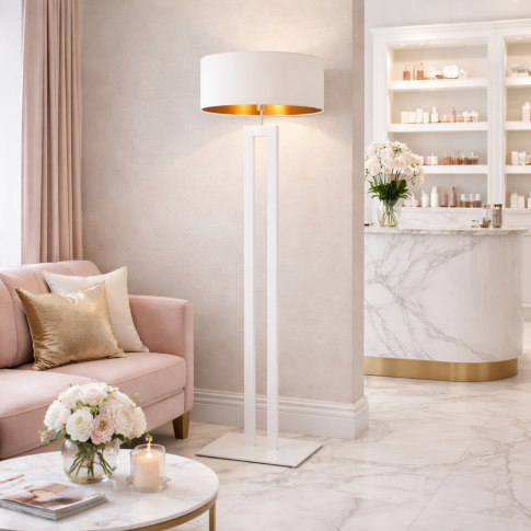 Nowoczesna lampa podłogowa z białym abażurem KALIFORNIA GOLD ma wysokość 161 cm i szerokość 40 cm, dzięki czemu jest wystarczająco wysoka i smukła, aby subtelnie dominować przestrzeń, jednocześnie nie przytłaczając jej. To idealna lampa podłogowa do eleganckich wnętrz, która dzięki złotym akcentom i nowoczesnej konstrukcji wprowadza do wnętrza element luksusu i stylu glamour. Sprawdzi się zarówno w większych jak i mniejszych pomieszczeniach, wprowadzając ciepłe i eleganckie światło, które będzie przyciągać wzrok i tworzyć przytulną atmosferę.