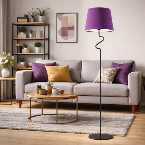 Funkcjonalna i elegancka lampa stojąca z fioletowym kloszem