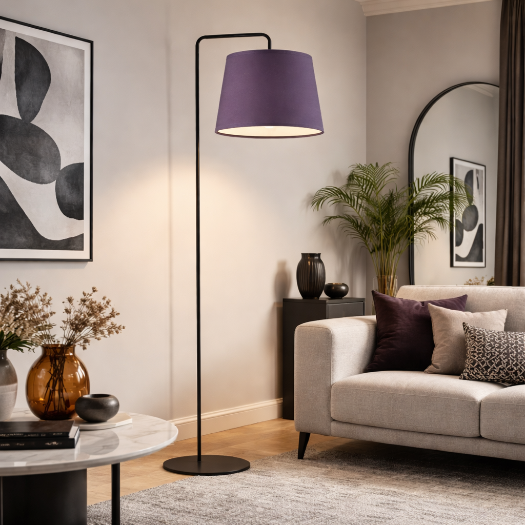 Czarna lampa stojąca z fioletowym abażurem RIJAD została zaprojektowana i wyprodukowana w Polsce przez renomowaną częstochowską markę LYSNE.PL znaną z designerskich i funkcjonalnych projektów oświetleniowych. Ta elegancka lampa podłogowa jest nie tylko źródłem światła, ale także stylowym elementem dekoracyjnym, który wprowadza przyjemną, domową atmosferę do każdego wnętrza. RIJAD charakteryzuje się prostą, minimalistyczną konstrukcją, która doskonale wpisuje się w współczesne trendy wnętrzarskie. Klasyczny, stożkowy abażur dostępny w kilkunastu różnych kolorach, nadaje jej uniwersalny charakter, który łatwo dopasować do różnych stylów aranżacyjnych, od nowoczesnego minimalizmu po bardziej klasyczne wnętrza. Wykorzystanie wysokiej jakości materiałów gwarantuje trwałość i estetykę lampy. Konstrukcja wykonana z solidnego metalu dostępna w kilku wariantach kolorystycznych zapewnia stabilność i elegancki wygląd. Materiałowy klosz równomiernie rozprasza światło tworząc przytulną atmosferę w pomieszczeniu. Nowoczesna lampa podłogowa RIJAD jest idealnym rozwiązaniem do salonu, sypialni, gabinetu czy biura. Jej uniwersalny design sprawia, że może służyć zarówno jako główne źródło światła, jak i jako dodatkowe, akcentowe oświetlenie, które podkreśla wybrane elementy wystroju wnętrza. Dzięki przemyślanej konstrukcji i odpowiedniej wysokości, oryginalna lampa stojąca LED doskonale sprawdzi się przy fotelu do czytania, kanapie czy biurku.