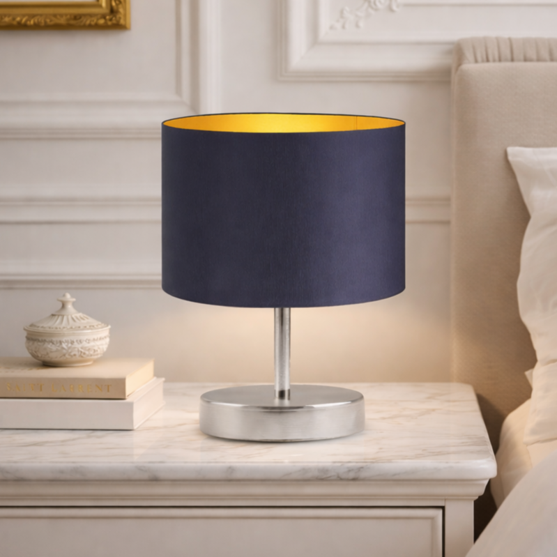 Lampka nocna z granatowym abażurem AWINION GOLD to kwintesencja elegancji zawarta w kompaktowym rozmiarze. Idealna dla tych, którzy cenią wyrafinowanie i funkcjonalność. Cylindryczny abażur o wysokości 12 cm i szerokości 17,5 cm zapewnia optymalne rozproszenie światła, delikatnie wypełniając pomieszczenie miękkim, ciepłym blaskiem. Materiałowy abażur ze złotym wnętrzem tworzy atmosferę spokoju i relaksu, doskonałą do nocnego czytania lub spokojnego snu. Złote wnętrze klosza dodatkowo wzmacnia ciepły blask, który delikatnie otula wnętrze nadając mu przytulnego ale i luksusowego charakteru. Żółto-złote refleksy nie tylko podkreślają elegancję oprawy, ale również tworzą wyjątkowo relaksującą atmosferę. Dzięki swojej oszczędnej formie lampka nocna do kontaktu doskonale wpisze się w małe przestrzenie nie tracąc przy tym swojego uroku. Zaskakująco wszechstronna lampka nocna z abażurem z łatwością dostosowuje się do różnorodnych aranżacji wnętrzarskich, od ciepłych, domowych zakątków po eleganckie przestrzenie publiczne, takie jak hotele czy kawiarnie.