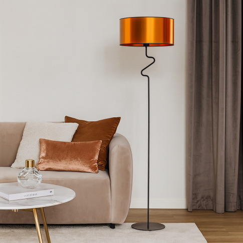 Czarno-miedziana lampa stojąca MORONI MIRROR to nowoczesny i elegancki element oświetlenia, który doskonale łączy estetykę z funkcjonalnością. Ten wyjątkowy model oferuje wybór abażura w dwóch luksusowych kolorach: złotym lub miedzianym, które wprowadzają do wnętrza ciepły, elegancki akcent. Czarna podstawa o matowym wykończeniu tworzy idealny kontrast z abażurem, podkreślając minimalistyczny, a zarazem wyrafinowany charakter lampy. Na szczególną uwagę zasługuje konstrukcja, która w górnej części posiada ozdobne zagięcie w kształcie fali. Ta lampa podłogowa o prostym designie to idealne rozwiązanie dla wielbicieli nowoczesnego stylu, którzy cenią minimalistyczne i funkcjonalne elementy wyposażenia wnętrz. Dzięki temu lampa nie tylko spełnia swoją rolę oświetleniową, ale również staje się subtelnym, a zarazem wyrazistym akcentem dekoracyjnym w nowoczesnych przestrzeniach.