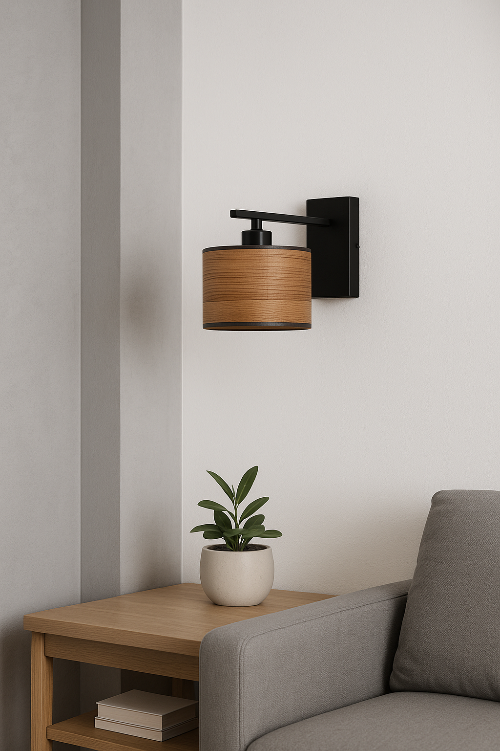Geometryczna forma kinkietu SPLIT ECO to kwintesencja nowoczesnej prostoty, która łączy funkcjonalność z estetyką. Wykonana z trwałego metalu, dostępna jest w pięciu wariantach kolorystycznych: białym, czarnym, chromowym, szczotkowanej stali oraz starym złocie. Te uniwersalne opcje pozwalają na łatwe dopasowanie konstrukcji do każdej aranżacji wnętrza. Cylindryczny abażur o wymiarach 17 x 12 cm został wyprodukowany z materiału PVC, który odwzorowuje naturalną strukturę drewna, tworząc efekt tzw. forniru. Abażur dostępny jest w czterech stylowych ubarwieniach: dąb bielony, orzechowy, dąb sonoma oraz kasztanowy, co umożliwia perfekcyjne dopasowanie lampy do kolorystyki mebli i podłóg. Nowoczesny kinkiet ścienny SPLIT ECO to idealne oświetlenie do wnętrz urządzonych w stylu skandynawskim, gdzie dominuje jasne drewno, naturalne tekstylia i przytulna atmosfera. Jego minimalistyczna forma oraz "drewniane wykończenie abażuru" wspaniale wkomponuje się również w przestrzenie w stylu boho lub rustykalnym, gdzie ceni się połączenie prostoty i bliskości natury. Dzięki możliwości wyboru stonowanych kolorów stelaża i abażuru, lampa doskonale uzupełni także nowoczesne, industrialne aranżacje w których surowość betonu czy metalu łagodzi ciepły odcień imitacji drewna. Kinkiet SPLIT ECO to nie tylko designerski dodatek, ale również funkcjonalne źródło światła, które wprowadzi do wnętrza harmonię i przytulność.