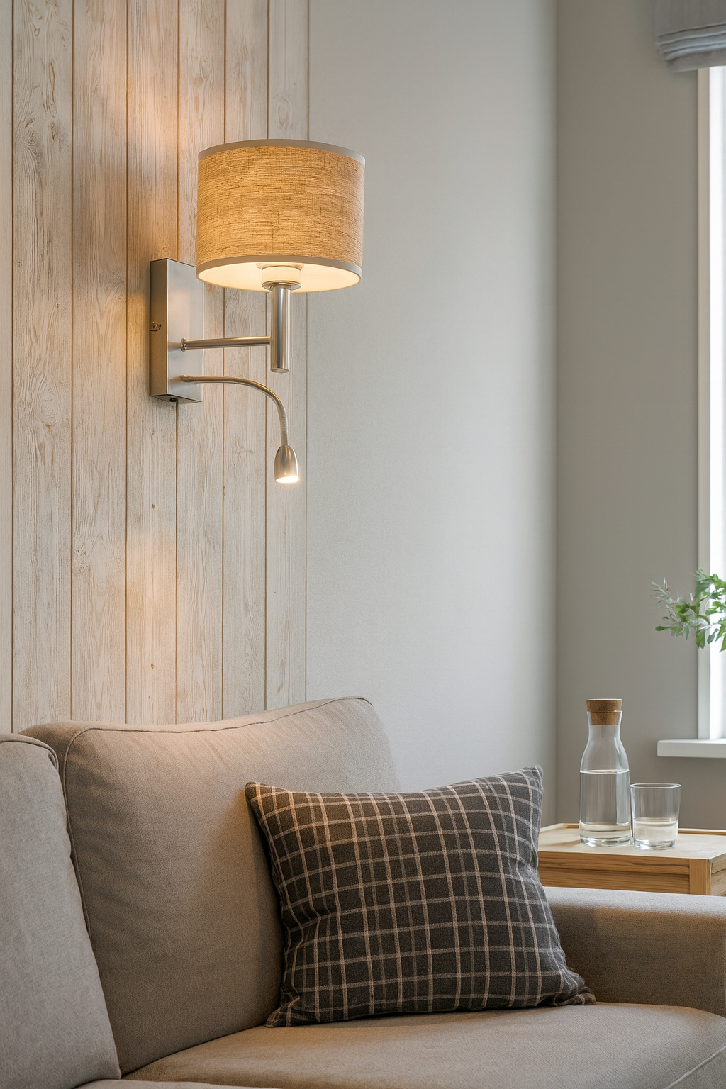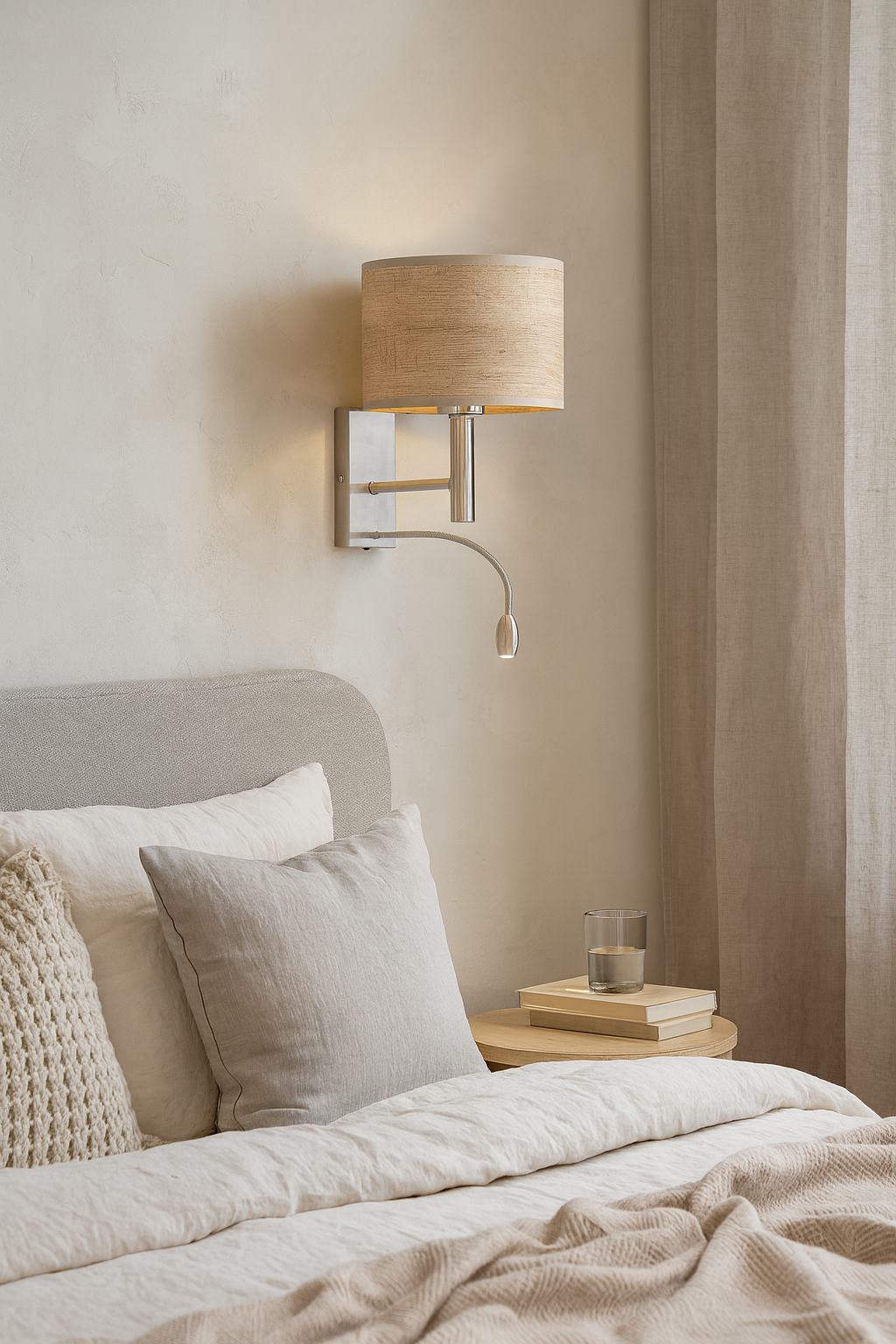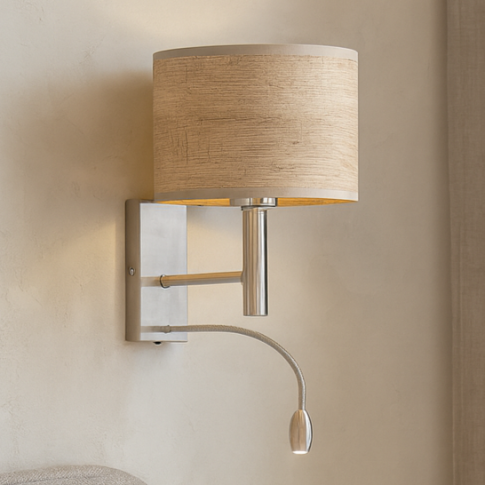 Panel LED został umieszczony na giętkim, elastycznym ramieniu, co pozwala na swobodne kierowanie strumieniem światła w wybrane miejsce. To idealne rozwiązanie jeśli szukasz kinkietu ściennego do czytania nad łóżkiem albo lampy ściennej do pracy i relaksu. Główne światło oprawy rozchodzi się w górę i dół delikatnie przenikając przez fornirowy abażur i tworząc przyjemny klimat we wnętrzu. Dodatkowym atutem są dwa niezależne włączniki dźwigniowe, które pozwalają sterować źródłami światła oddzielnie – to ogromna wygoda i przykład, że 2-punktowy kinkiet ścienny FLORYDA ECO został zaprojektowany z myślą o komforcie użytkowników.