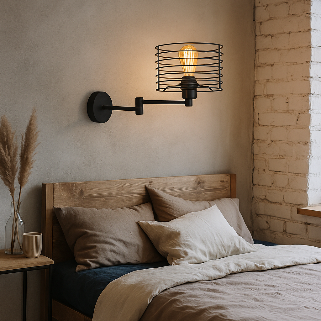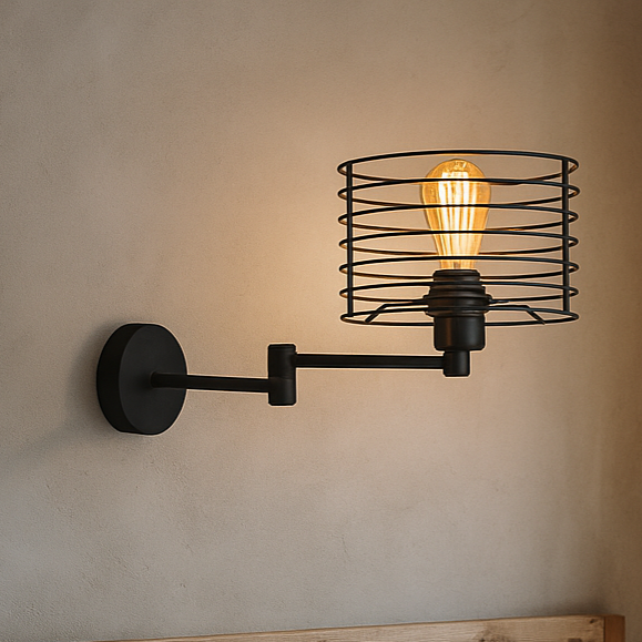 Loftowy kinkiet ścienny ALICANTE jest regulowany w płaszczyźnie prawo-lewo. Sprawdzi się idealnie jako kinkiet do czytania w sypialni a także jako gustowna ozdoba i praktyczne oświetlenie w jednym. Może pełnić funkcję zarówno głównego oświetlenia w pomieszczeniu jak i klimatycznej lampki ściennej, której zadaniem będzie jedynie doświetlenie wnętrza. Model został wykonany z materiałów o najwyższej jakości pochodzących z Polski. Na konstrukcję lampy ściennej składa się owalna podstawa z wysięgnikiem oraz geometryczny klosz. Druciany, metalowy klosz został przystosowany do żarówki z gwintem E27 i mocą do 60W (żarówka nie jest dołączona do zestawu).