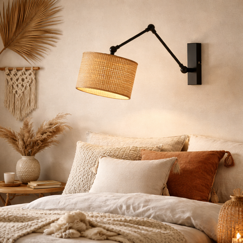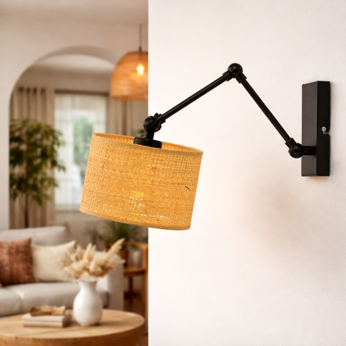 Dzięki regulowanej konstrukcji HAMILTON BOHO to praktyczny kinkiet z regulowanym ramieniem, który umożliwia precyzyjne skierowanie światła tam, gdzie jest najbardziej potrzebne. Sprawdzi się jako kinkiet boho do salonu, oświetlenie przy sofie lub fotelu, a także jako kinkiet rattanowy do sypialni, idealny do czytania przed snem. Regulowana rozpiętość ramienia (około 40 cm) zwiększa komfort użytkowania i czyni lampę niezwykle uniwersalną.