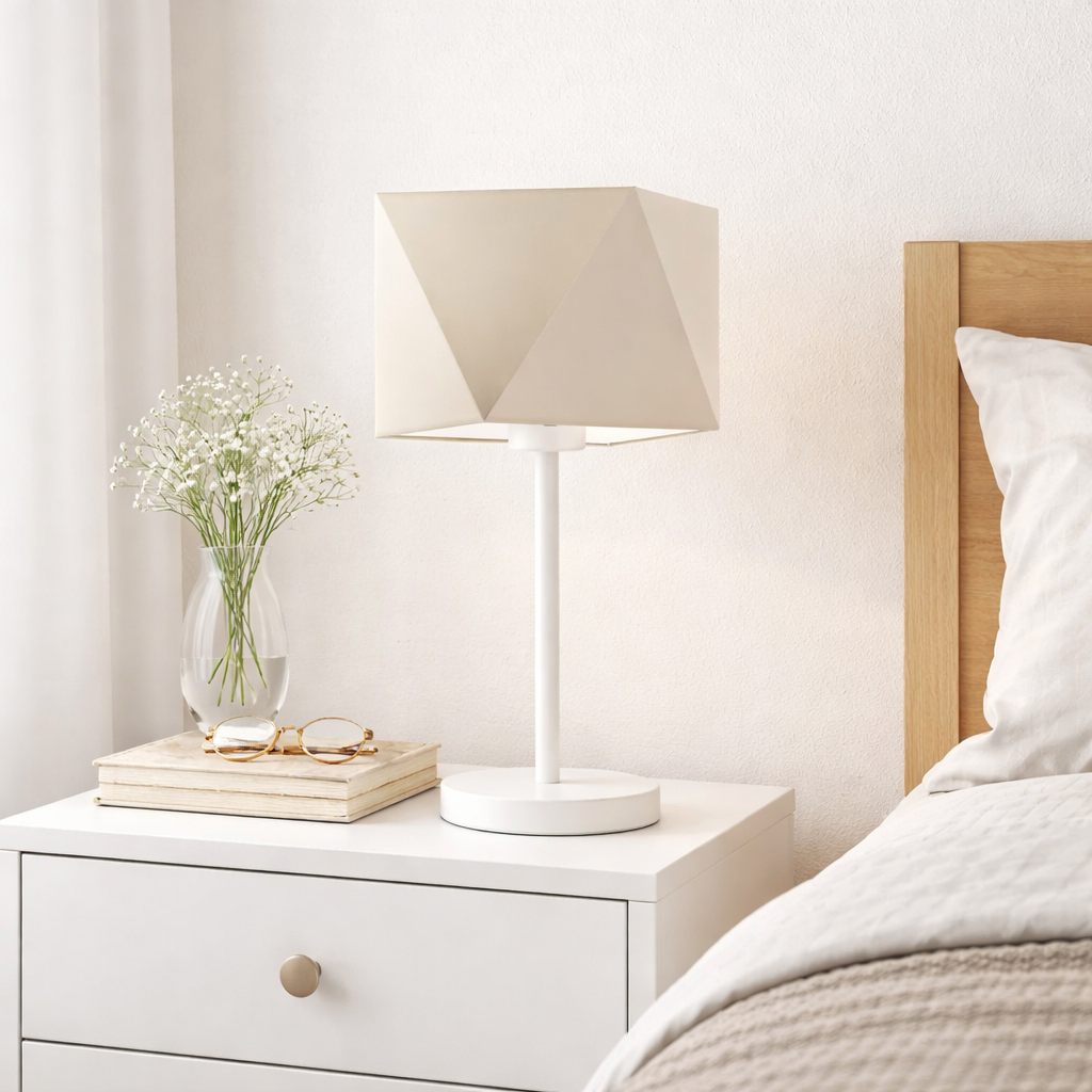 Lampka nocna WUHU od LYSNE.PL — polskiego producenta designerskich lamp z abażurami — wyróżnia się prostą, a jednocześnie bardzo elegancką formą. Składa się ze stabilnego, metalowego stelaża z okrągłą podstawą i klosza z holenderskiej tkaniny tekstylnej, który powstał z inspiracji strukturą diamentu. Materiałowy abażur ma 23-centymetrową przekątną i 16 cm wysokości. Lampka nocna z kremowym abażurem o szerokości 23 cm, w pionie mierzy 43 cm. Dzięki dostępności różnych kolorów klosza (biały, ecru, jasny szary (gołębi), miętowy, musztardowy, jasny różowy, jasny fioletowy, beżowy, szary stalowy, czerwony, niebieski, fioletowy, zieleń butelkowa, granatowy, grafitowy, brązowy, czarny oraz szary melanż (tzw. beton)) oraz sześciu rodzajów powłok stelaża — srebrny, biały, czarny (w standardzie), chrom, stal szczotkowana, stare złoto (wariant dodatkowo płatny), możesz stać się projektantem we własnym domu! Mieszaj kolory i korzystaj z naszych inspiracji! Nowoczesna lampka na stolik nocny z abażurem WUHU jest dostosowana do żarówek z tzw. dużym gwintem (E27) o maksymalnej mocy 60W. Pasują do niej zarówno żarówki LED, jak i źródła światła o klasach energetycznych od A do G. Producent zapewnia 24-miesięczny okres gwarancji na lampkę nocną WUHU.