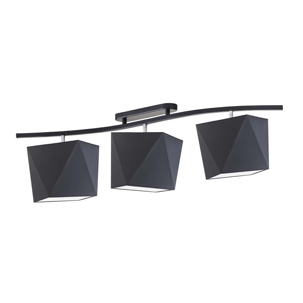 Czarny żyrandol 3 - punktowy FARGO to propozycja oświetlenia dla fanów designu i nowatorskich rozwiązań. Minimalistyczna lampa sufitowa składa się z trzech abażurów z holenderskiej tkaniny tekstylnej umieszczonych na podłużnej, lekko pofalowanej, metalowej podsufitce. FARGO ma możliwość regulacji kąta padania światła, co pozwala na doświetlenie wybranej przestrzeni i podkreślenie elementów dekoracyjnych we wnętrzu. Abażury plafonu FARGO są dostępne w kilkunastu wersjach kolorystycznych: białej, ecru, jasnej szarej (gołębiej), miętowej, musztardowej, jasnej różowej, jasnej fioletowej, beżowej, szarej (stalowej), czerwonej, niebieskiej, fioletowej, butelkowej zieleni, granatowej, grafitowej, brązowej, czarnej oraz szarego melanżu (tzw. betonowej). Do wyboru mamy także trzy rodzaje stelaża — biały, srebrny lub czarny. Do plafonu FARGO pasują trzy żarówki o maksymalnej mocy 60W i klasach energetycznych od A do G lub żarówki LED.