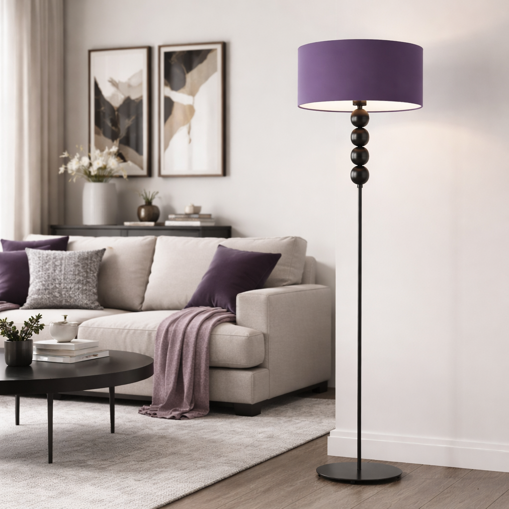 Kulista lampa stojąca na czarnym stelażu z fioletowym abażurem BERMUDY do pokoju młodzieżowego