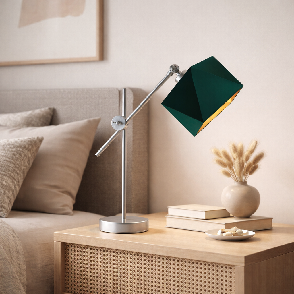 Elegancka lampa stołowa BELO GOLD o regulowanej wysokości 50 cm i szerokości 20 cm jest na tyle uniwersalna, że z łatwością znajdzie swoje miejsce w różnych częściach domu. Możesz ją umieścić na komodzie, parapecie, czy też na szafce nocnej obok łóżka. Kompaktowe wymiary i elegancki design srebrnej lampki nocnej pozwalają na dużą elastyczność w aranżowaniu przestrzeni, dodając stylowy akcent do każdego wnętrza. BELO GOLD doskonale komponuje się z różnorodnymi stylami wnętrzarskimi dzięki swojej uniwersalnej kolorystyce. Bez trudu wpasuje się w aranżacje skandynawskie, nowoczesne, industrialne czy loftowe. Nowoczesna lampka biurkowa z regulacją nie tylko elegancko wygląda, ale jest również funkcjonalna. Za sprawą regulowanego ramienia na którym oparty jest geometryczny abażur stanowi idealne rozwiązanie do czytania oraz innych czynności wymagających dostosowania intensywności oświetlenia. Nowoczesna lampka biurkowa BELO doskonale harmonizuje z jasnym drewnem oraz stonowanymi, łagodnymi barwami, tworząc ciepłą i przytulną atmosferę. Idealnie komponuje się z kontrastującymi akcentami w kolorze czarnym, które dodają wnętrzu charakteru. Doskonale sprawdzi się jako element oświetlenia w różnych strefach domu – od przytulnej sypialni po funkcjonalny salon. Jeśli szukasz więcej inspiracji, zobacz także nasze lampy do sypialni oraz lampy do salonu, które pomogą stworzyć spójną i komfortową aranżację w całym wnętrzu.