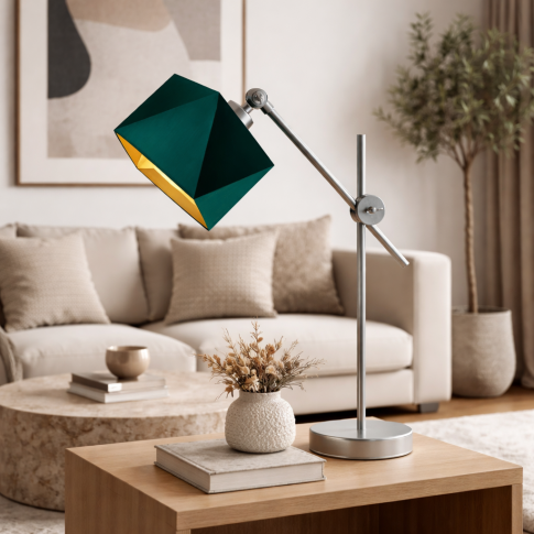 Lampki biurkowe z regulacją to wszechstronny rodzaj oświetlenia stołowego, który doskonale sprawdzi się w różnych przestrzeniach roboczych, takich jak domowe biura czy pokój młodzieżowy. Konstrukcja tej nowoczesnej lampki biurkowej BELO GOLD obejmuje metalową podstawę z regulowanym wysięgnikiem i kompaktowy klosz dostępny w kilku klasycznych kolorach. Ruchome ramię BELO zwiększa funkcjonalność oprawy, pozwalając na skierowanie światła dokładnie tam, gdzie jest aktualnie najbardziej potrzebne. Cechą charakterystyczną tego modelu jest klosz w formie diamentu ze złotym wnętrzem. Abażur z złotym wnętrzem to elegancki element oświetleniowy, który skutecznie potęguje efekt wizualny emitowanego światła. Złote wykończenie klosza nie tylko wzmacnia odbicie światła, ale także nadaje mu ciepły, złocisty ton, co przekłada się na wyjątkową atmosferę w pomieszczeniu. Zastosowanie takiego oświetlenia może znacząco podnieść estetyczny standard wnętrza, dodając mu luksusowego charakteru. Ta kombinacja designu i funkcjonalności nie tylko gwarantuje trwałość, ale również umożliwia elastyczne dostosowanie oświetlenia do indywidualnych potrzeb użytkownika. BELO wpisuje się w nowoczesne oraz minimalistyczne wnętrza, czyniąc je niezbędnym elementem każdej przemyślanej aranżacji.