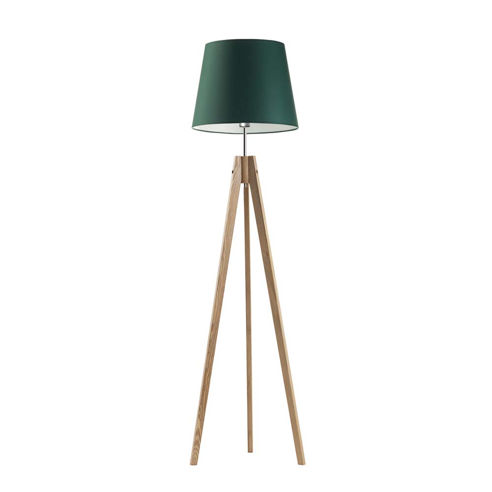 Abażur w kształcie stożka wykonany został z holenderskiej tkaniny tekstylnej podklejonej na białej lub bezbarwnej folii PVC (w przypadku koloru betonowego), natomiast stelaż to naturalne drewno sosnowe. Niezaprzeczalną zaletą tej lampy stojącej z drewna jest wybór koloru abażuru spośród kilkunastu wariantów kolorystycznych oraz 5 kolorów drewna (białego, popielatego, dębowego, mahoniowego oraz hebanowego). Lampę stojącą na trójnogu docenią miłośnicy prostych form i oszczędnego stylu.