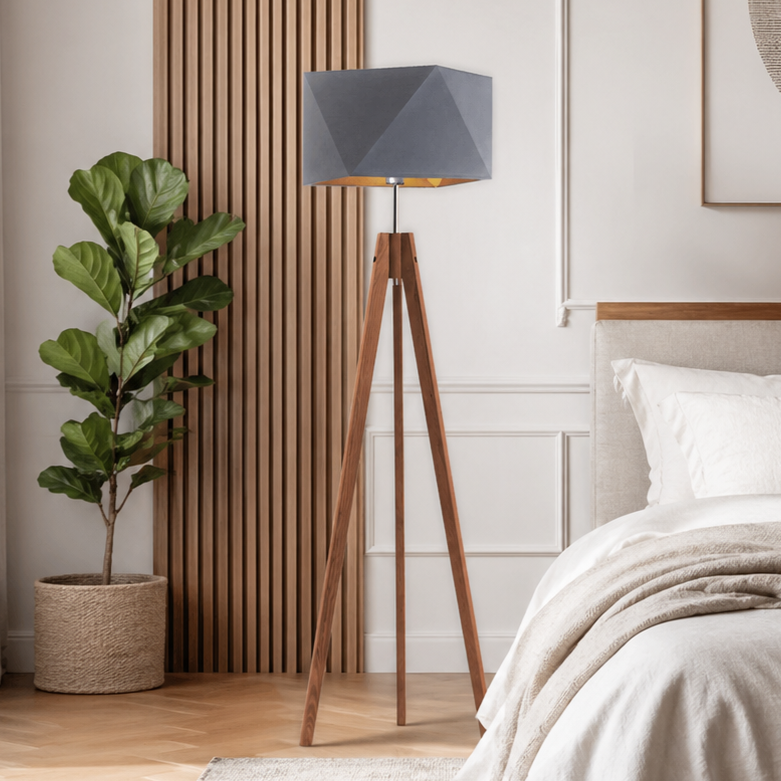 Drewniana lampa stojąca do sypialni LAGOS GOLD to nowoczesne oświetlenie, które efektownie ozdobi i rozpromieni Twoje wnętrze. Ta stylowa lampa podłogowa drewniana na trójnogu o wysokości 144 cm, wyposażona w diamentowy abażur o przekątnej 45 cm, została zaprojektowana z myślą o przestrzeniach wypoczynkowych, takich jak sypialnia czy salon.