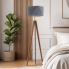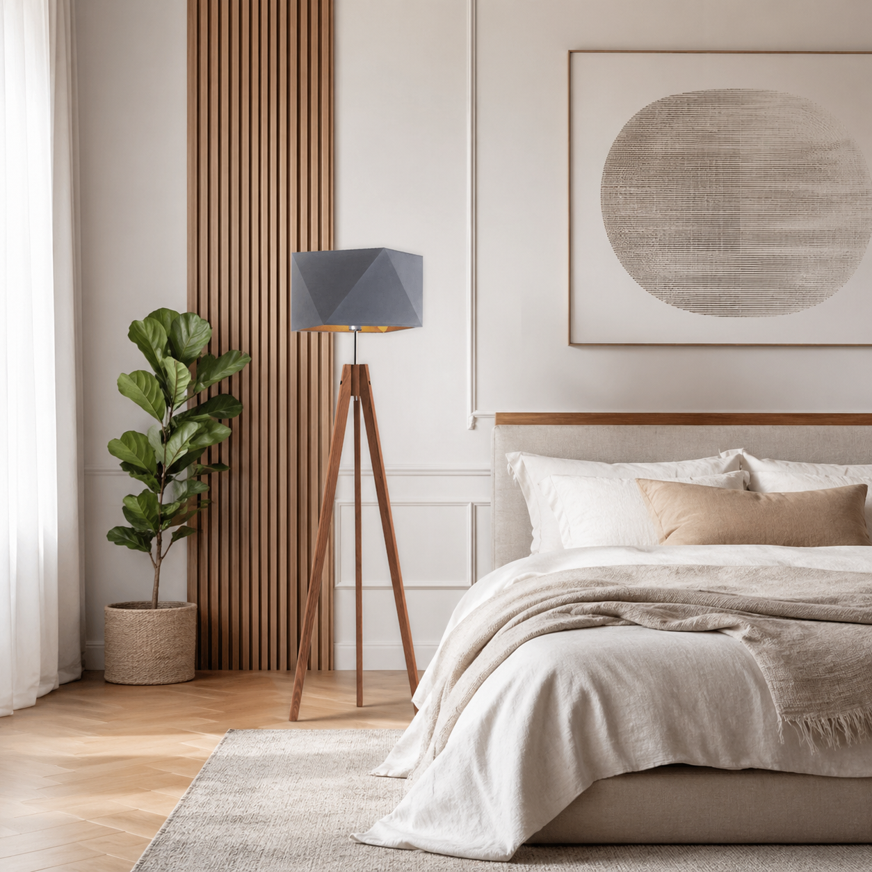 Jednym z największych atutów modelu LAGOS GOLD jest możliwość personalizacji. Lampa podłogowa drewniana na trójnogu dostępna jest w wielu wariantach kolorystycznych abażura oraz pięciu wersjach stelaża: białym, popielatym, dębowym, mahoniowym i hebanowym. Stylowy abażur wykonany został z certyfikowanej, niepalnej tkaniny tekstylnej, co wpływa na bezpieczeństwo użytkowania. Drewniana konstrukcja podkreśla naturalny charakter lampy i doskonale wpisuje się w stylistykę skandynawską oraz japandi. W bardziej odważnych aranżacjach, np. loftowych, lampa stojąca z drewnianą podstawą może stanowić kontrastowy element dekoracyjny, który przyciąga uwagę i podkreśla indywidualny charakter wnętrza. To sprawia, że drewniana lampka podłogowa z abażurem jest rozwiązaniem niezwykle uniwersalnym i ponadczasowym.