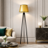 Lampa stojąca do salonu CURACAO z serii MIRROR to najnowsza propozycja polskiego producenta opraw oświetleniowych LYSNE.PL. Ten model designerskiej lampy podłogowej łączy w sobie naturalne piękno drewna z wysokiej jmateriałami. Konstrukcja oprawy przypomina trójnożny stelaż aparatu fotograficznego. Całość zwieńcza abażur w kształcie stożka wykonany z materiału PVC o nietypowych właściwościach. Złoty klosz posiada fakturę przypominającą powierzchnię lustra, w której można się przejrzeć. Po włączeniu lampy blask żarówki subtelnie przebija się przez materiał abażuru prezentując się przy tym dość widowiskowo. Wydobywające się światło jest niezwykle miłe i przyjemne dla oka. Złote lampy stojące idealnie wpasują się w nowoczesne wnętrza sypialniane czy salony urządzone w stylu glamour.