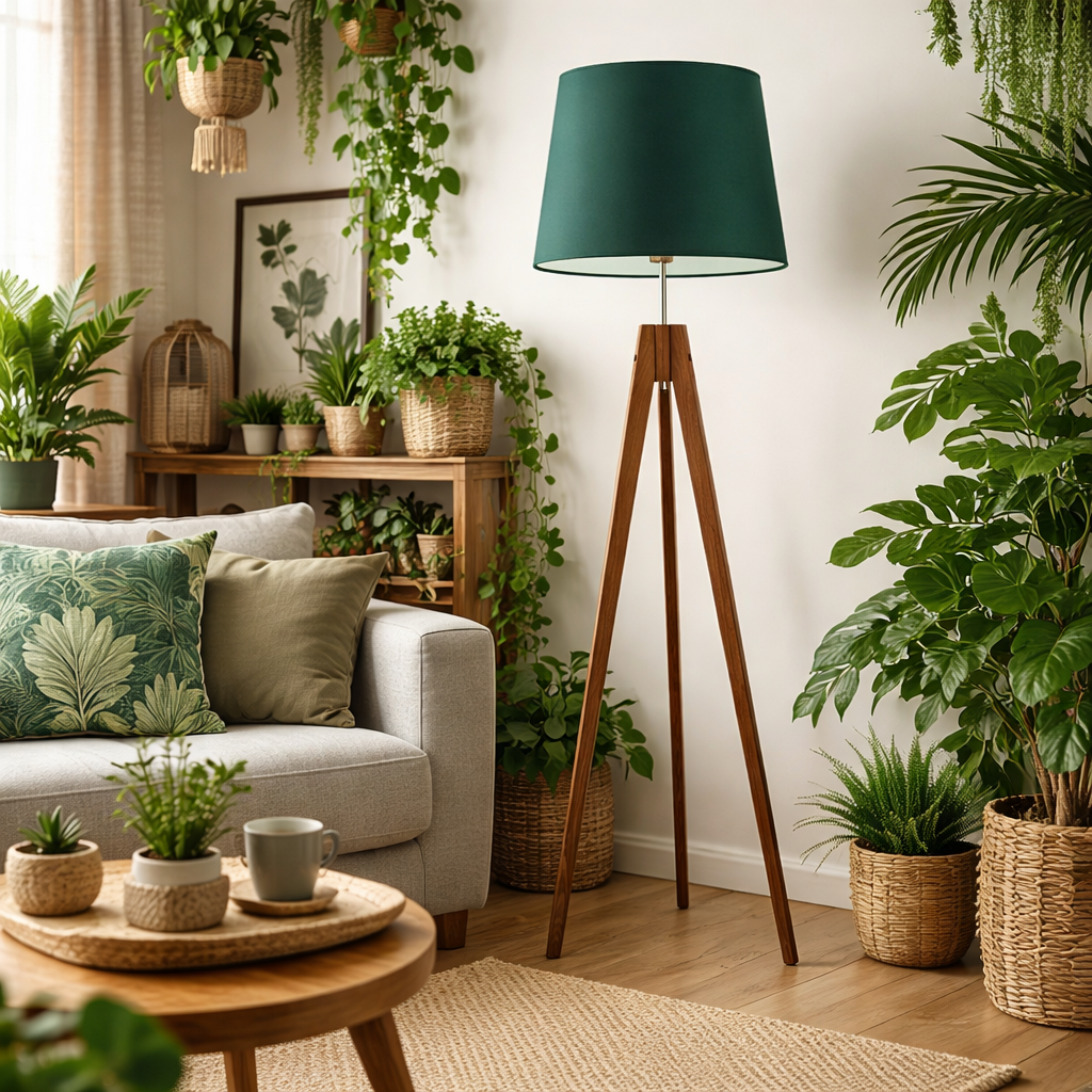 Lampa podłogowa trójnóg drewniana ARUBA abażur zieleń butelkowa stożek E27 LED