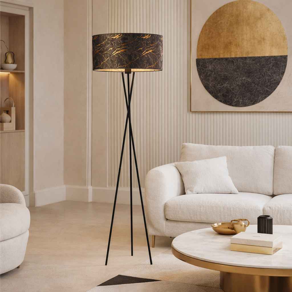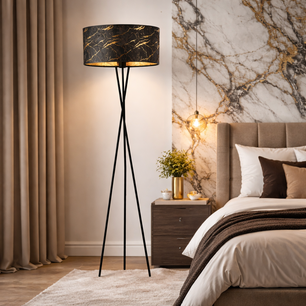 Lampy podłogowe typu tripod to stylowe oświetlenie, które znamy z największych magazynów wnętrzarskich. Te designerskie konstrukcje są szczególnie doceniane przez fanów innowacyjnych rozwiązań. Trójnóg lampy jest dużo bardziej stabilniejszy od pojedynczego stelaża, dlatego tripody często wybierane są chociażby do domów z dziećmi. PARYŻ MARMUR oprócz stabilnej podstawy, która zabezpiecza lampę przed przechyleniem się i upadkiem, posiada także tkaninowy klosz spełniający wszelkie standardy bezpieczeństwa, co potwierdza certyfikat niepalności abażuru. Tkanina, z której wykonano abażur to wysokojakościowy materiał imitujący ponadczasowy marmur.