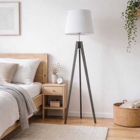 Abażur w kształcie stożka wykonany został z holenderskiej tkaniny tekstylnej podklejonej na białej lub bezbarwnej folii PVC (w przypadku koloru betonowego), natomiast stelaż to naturalne drewno sosnowe. Niezaprzeczalną zaletą tej lampy stojącej z drewna jest wybór koloru abażuru spośród kilkunastu wariantów kolorystycznych oraz 5 kolorów drewna (białego, popielatego, dębowego, mahoniowego oraz hebanowego). Lampę stojącą na trójnogu docenią miłośnicy prostych form i oszczędnego stylu.