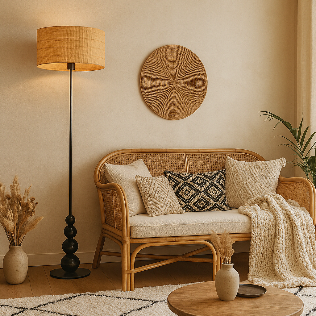 Czarno-beżowa lampa stojąca ROMA BOHO to idealny wybór dla miłośników naturalnych, przytulnych aranżacji. Dzięki rattanowemu kloszowi i minimalistycznemu stelażowi z dekoracyjnymi kulami, oprawa ta wprowadza do wnętrza odrobinę natury i ciepła, jednocześnie zachowując elegancki, nowoczesny wygląd. Lampa podłogowa w stylu boho świetnie sprawdzi się w salonach, gdzie stanie się centralnym punktem oświetleniowym, tworząc wyjątkową, relaksującą atmosferę. Z powodzeniem można ją także ustawić w sypialni, gdzie jej delikatne, rozproszone światło pomoże stworzyć klimatyczną przestrzeń sprzyjającą wypoczynkowi. Styl boho doskonale współgra z tą lampą, która dzięki swojemu rattanowemu kloszowi i stonowanym barwom wpisuje się w trend lamp naturalnych handmade w stylu boho. Czarno-beżowa kolorystyka sprawia, że lampa stojąca boho do salonu pasuje zarówno do wnętrz pełnych drewna, plecionek i tekstyliów, jak i do nowoczesnych przestrzeni, które wymagają ocieplenia akcentami inspirowanymi naturą. Lampy w stylu boho takie jak ten model to doskonały wybór do pomieszczeń utrzymanych w duchu skandynawskim, gdzie minimalizm łączy się z elementami organicznymi, a także do wnętrz w stylu eko, w których dominują naturalne materiały. ROMA BOHO to prawdziwe dzieło sztuki użytkowej, która idealnie wkomponuje się w kącik do czytania, w przytulny salon czy klimatyczną sypialnię, tworząc ciepłą atmosferę w każdej aranżacji.