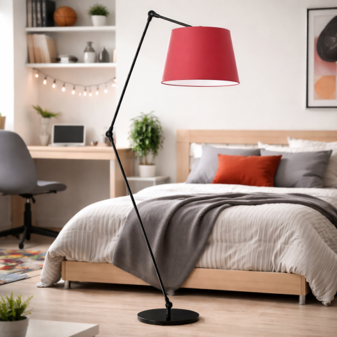 Uniwersalna konstrukcja, stożkowy abażur oraz ruchome ramię lampy stojącej czynią ją nie tylko funkcjonalnym źródłem światła, ale również elementem dekoracyjnym. Zastosowany przegub umożliwia precyzyjne ustawienie kierunku świecenia, a stabilna podstawa zapewnia bezpieczeństwo użytkowania. Dodatkowym atutem jest wygodny włącznik nożny umieszczony na przewodzie. Model ten doskonale komponuje się z innymi elementami oświetlenia, takimi jak kinkiet ścienny regulowany AUSTIN z dodatkowym panelem LED, lampka nocna z czerwonym abażurem SIENA oraz nowoczena lampa sufitowa TAMPA, tworząc spójną aranżację wnętrza.