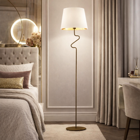 Biała lampa podłogowa FOGO to elegancki element oświetlenia z kolekcji GOLD zaprojektowany przez renomowaną polską markę LYSNE.PL. Charakteryzuje się wyjątkowym, metalowym stelażem dostępnym w kilku kolorach o unikalnym kształcie, który subtelnie zakrzywia się w górnej części, tworząc harmonijną sylwetkę. Stabilność konstrukcji zapewnia solidna, okrągła podstawa z antypoślizgowymi nóżkami, co sprawia, że całość osiąga imponującą wysokość 174 cm i 37 cm szerokości. Zwieńczeniem tej designerskiej lampy podłogowej do salonu jest starannie wykonany stożkowy abażur dostępny w szerokiej gamie kolorystycznej. Cechą charakterystyczną klosza jest złota ampla, która odbija światło i subtelnie podkreśla złote akcenty we wnętrzu. Dodaje elegancji pomieszczeniu w którym dominuje neutralna kolorystyka. Wysokiej jakości holenderska tkanina tekstylna abażura nadaje oprawie wyjątkowej trwałości i estetykę, która pozwala dostosować FOGO do różnorodnych wnętrz.
