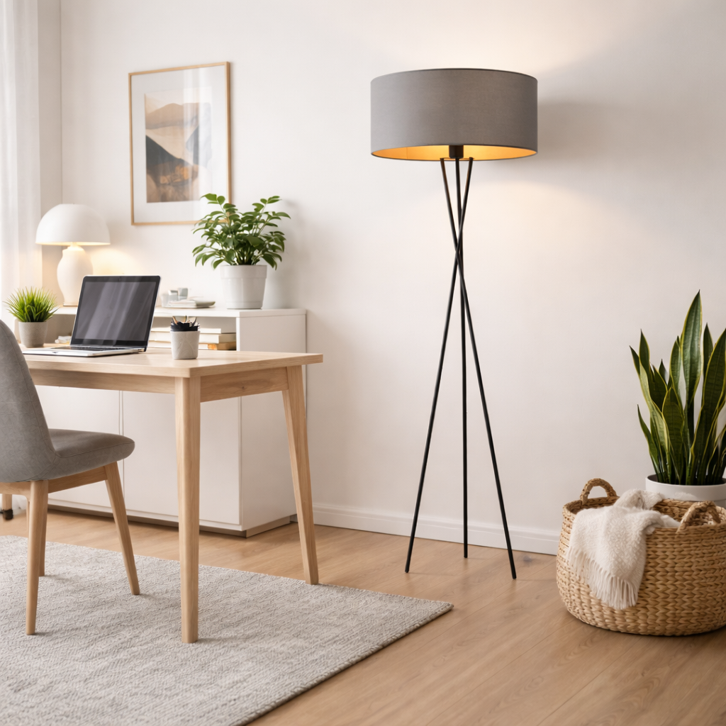 Lampa podłogowa na trójnogu nie tylko zachwyca wyglądem ale też solidnością wykonania. Metalowe elementy stelaża zapewniają stabilność i trwałość, a minimalistyczna forma dodaje jej lekkości i elegancji. Lampa o wysokości 160 cm i szerokości 40 cm idealnie sprawdzi się zarówno w salonie jak i w sypialni, dodając wnętrzu niepowtarzalnego klimatu. Jest to piękna lampa stojąca do salonu, która potrafi stać się centralnym punktem aranżacji, oferując nie tylko piękno, ale również doskonałą funkcjonalność – dostosowana do żarówek o klasach energetycznych od A do G jak i energooszczędnych LED, zapewni długotrwałe i przyjazne środowisku oświetlenie.