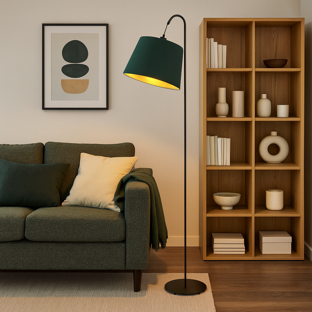 Ta stylowa lampa podłogowa łączy nowoczesny design z delikatnym urokiem klasyki, tworząc wyjątkowy element oświetlenia do każdego wnętrza. Lampa podłogowa wyposażona jest w elegancki, stożkowy abażur wykonany z wysokiej jakości tkaniny tekstylnej, który wykończony jest wewnątrz złotym kolorem. To subtelne wykończenie dodaje ciepła i luksusu, wprowadzając do pomieszczenia wyjątkowy nastrój, gdy lampa jest włączona. Wymiary klosza (wysokość - 28 cm, szerokość - 28 cm (górna średnica), 37 cm (dolna średnica)) są na tyle uniwersalne, że oprawa znajdzie swoje miejsce nawet w niewielkich przestrzeniach. Dodatkowo tkanninowy klosz występuje w kilku wariantach kolorystycznych: białym, czarnym, szarym, granatowym i butelkowej zieleni. Minimalistyczna konstrukcja podstawy podkreśla nowoczesny charakter oprawy a zakrzywione ramię dodaje jej nieco delikatnej lekkości. Taka konstrukcja sprawia, że lampa idealnie wpisuje się w aranżacje utrzymane w stylu glamour, gdzie elegancja i luksus grają główną rolę. TALLIN GOLD doskonale pasuje również do stylu nowoczesnego, w którym minimalizm i funkcjonalność są kluczowe. Ta designerska lampa stojąca będzie także świetnym dodatkiem do wnętrz w stylu eklektycznym, łączącym różne elementy i kolory, co pozwoli jej harmonijnie wpisać się w tak zróżnicowane otoczenie. Wysoka, smukła konstrukcja lampy nadaje jej wyrazistości, a jednocześnie sprawia, że jest ona idealnym rozwiązaniem do oświetlenia zarówno przestronnych wnętrz jak i tych, gdzie oszczędność miejsca gra pierwsze skrzypce.