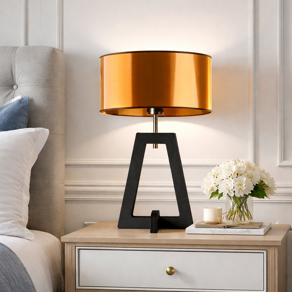 Niecodzienny design drewnianej lampy stołowej CLIO MIRROR tkwi przede wszystkim w kolorystyce abażura o średnicy 30 cm, który dostępny jest w ciepłych odcieniach złota lub miedzi. Wybór tych kolorów nie jest przypadkowy, oba te odcienie doskonale wpisują się w najnowsze trendy wnętrzarskie. Uwagę przyciąga połyskująca folia klosza, która spektakularnie manipuluje światłem. Tworzy przyjemny, ciepły blask. Ta niezwykła cecha sprawia, że światło rozchodzi się w pomieszczeniu w unikalny sposób, kreując wyjątkową atmosferę. Kontrastowe wykończenie abażuru czarną oblamówką dodatkowo podkreśla jego ekskluzywny charakter, tworząc wyrafinowany detal, który wzbogaci całość kompozycji. Obok lampy stołowej z drewnianą podstawą z pewnością nikt nie przejdzie obojętnie również ze względu na jej foremny stelaż. Hebanowa podstawa oprawy składa się z dwóch nóg zbiegających się ku górze, tworząc zamkniętą formę trapezu. Krzyż z drewnianych listew na podłożu zapewnia jej stabilną pozycję i nowoczesny design.