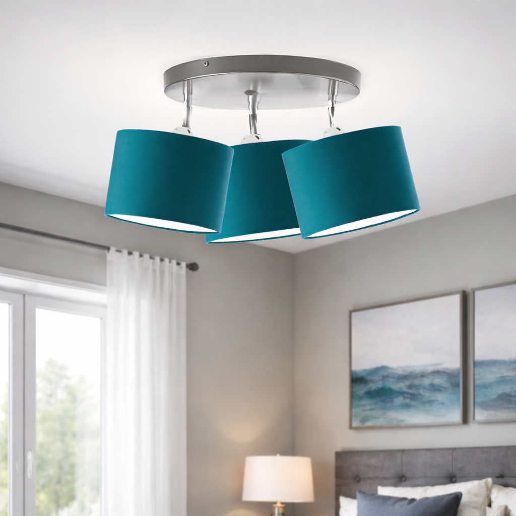 Lampa sufitowa 3-punktowa wisząca DAKOTA oferowana przez polskiego producenta nowoczesnych lamp LYSNE.PL jest stworzone do wnętrz o różnym przeznaczeniu i kolorystyce. Bogata oferta wariantów czyni ten 3 punktowy żyrandol dokładnie dopasowanym do indywidualnych potrzeb. Styl regulowanej lampy sufitowej DAKOTA jest klasyczny, dzięki czemu będzie doskonale uzupełniał aranżację salonu, przedpokoju, sypialni, a nawet kuchni. Optymalne wymiary plafonu z 3 kloszami (40 cm szerokości i 30 cm wysokości) sprawiają, że ten model oświetlenia pasuje nawet do niskich pomieszczeń, gdzie nie możemy sobie pozwolić na lampy typu zwis. Plafon z 3 żarówkami wyposażony jest w okrągłą podstawę, którą montujemy bezpośrednio do sufitu za pomocą wieszaka. Stelaż w tym modelu dostępny jest aż w 6 kolorach. Natomiast tkaninowe abażury występują aż w kilkunastu różnych barwach do wyboru. Dodatkową funkcjonalnością jest możliwość regulacji klosza, aby dostosować kąt padania światła. Do tego modelu lampy sufitowej pasują tradycyjne żarówki o mocy po 60W i gwincie E27 w klasach energetycznych od A do G oraz energooszczędne żarówki LED.