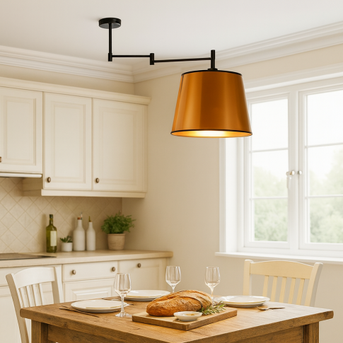 Najbardziej funkcjonalnym elementem lampy jest czarny stelaż wyposażony w ruchomy wysięgnik. Przegubowa budowa umożliwia zwrócenie źródła światła w każdą stronę. Taka opcja poprawia komfort użytkowania oprawy. Lampa z wysięgnikiem po całkowitym rozłożeniu ramienia osiąga szerokość 90 cm. Wysokość jest stała i wynosi 40 cm. Czarno-miedziana kolorystyka oprawy fantastycznie komponuje się z meblami utrzymanymi w estetyce art déco, gdzie dominują eleganckie linie, symetria oraz luksusowe akcenty. Miedziany środek abażura świetnie współgra również z ciemnym drewnem, marmurem, aksamitnymi tkaninami czy dodatkami w kolorze głębokiej zieleni, granatu lub czerni. Dzięki temu ten plafon z przegubem TAMPA GOLD staje się idealnym wyborem do wnętrz stylowych i dopracowanych w każdym detalu. Lampa sprawdzi się doskonale w przestrzeniach prywatnych – takich jak salon, jadalnia, sypialnia, przedpokój czy domowy gabinet – gdzie nie tylko zapewni odpowiednie doświetlenie, ale również stanie się wyrazistym akcentem dekoracyjnym. W kuchni może z powodzeniem pełnić funkcję światła zadaniowego zwłaszcza jeśli zostanie zawieszona nad wyspą lub blatem. Równie efektownie plafon TAMPA GOLD prezentuje się w przestrzeniach komercyjnych. Będzie świetnym wyborem do butików, eleganckich salonów kosmetycznych i fryzjerskich, kawiarni z artystycznym klimatem, hotelowych lobby, recepcji czy restauracji w stylu glamour lub modern classic. Wszędzie tam, gdzie liczy się zarówno funkcjonalność jak i stylowe, przyciągające wzrok detale – TAMPA GOLD spełni swoją rolę perfekcyjnie.
