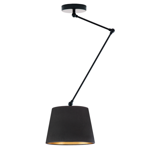 Czarna lampa sufitowa z granatowym abażurem welurowym to doskonały wybór dla osób ceniących połączenie nowoczesności z funkcjonalnością. Oferowana przez nasz sklep internetowy LYSNE.PL lampa JUMA VELUR wyróżnia się nie tylko swoim eleganckim designem, ale również wyjątkową praktycznością, dzięki czemu stanowi idealne rozwiązanie oświetleniowe do każdego wnętrza. Zaopatrzona w ruchome ramię z przegubami, oprawa umożliwia użytkownikom precyzyjne kierowanie strumieniem światła. Regulowana wysokość lampy sufitowej wahająca się od 40 cm do 100 cm, pozwala na elastyczne dopasowanie oświetlenia do rozmaitych pomieszczeń, od niewielkich kącików po przestronne salony i biura. Stożkowy klosz o średnicy 37 cm i wysokości 28 cm zapewnia optymalne rozproszenie światła. Lampa sufitowa z regulowanym ramieniem wpisze się zarówno w rolę głównego źródła światła jak i subtelniejszego, dodatkowego oświetlenia. JUMA to model nowoczesnej lampy sufitowej o walorach nie tylko funkcjonalnych ale także niezwykle dekoracyjna.