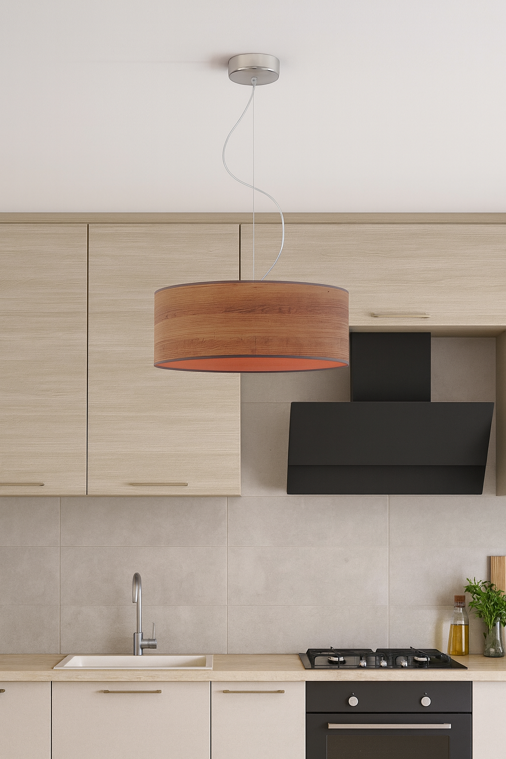 Designerska lampa wisząca nad stół HAJFA ECO to idealne połączenie funkcjonalności, elegancji i ekologicznego designu. Wyróżnia ją à la fornirowany abażur wykonany z trwałego tworzywa PVC, które doskonale imituje strukturę naturalnego drewna. Dzięki temu model ten doskonale wpisuje się w kategorię lamp wiszących w stylu skandynawskim oraz aranżacje utrzymane w duchu eko. Owalny abażur o średnicy 40 cm i wysokości 20 cm emituje przyjemne, rozproszone światło, które wprowadza do wnętrza ciepło i harmonię. HAJFA ECO z abażurem 40 cm to nowoczesna lampa wisząca do salonu, jadalni, kuchni lub sypialni – sprawdzi się w każdym pomieszczeniu w którym liczy się zarówno estetyka, jak i jakość światła.