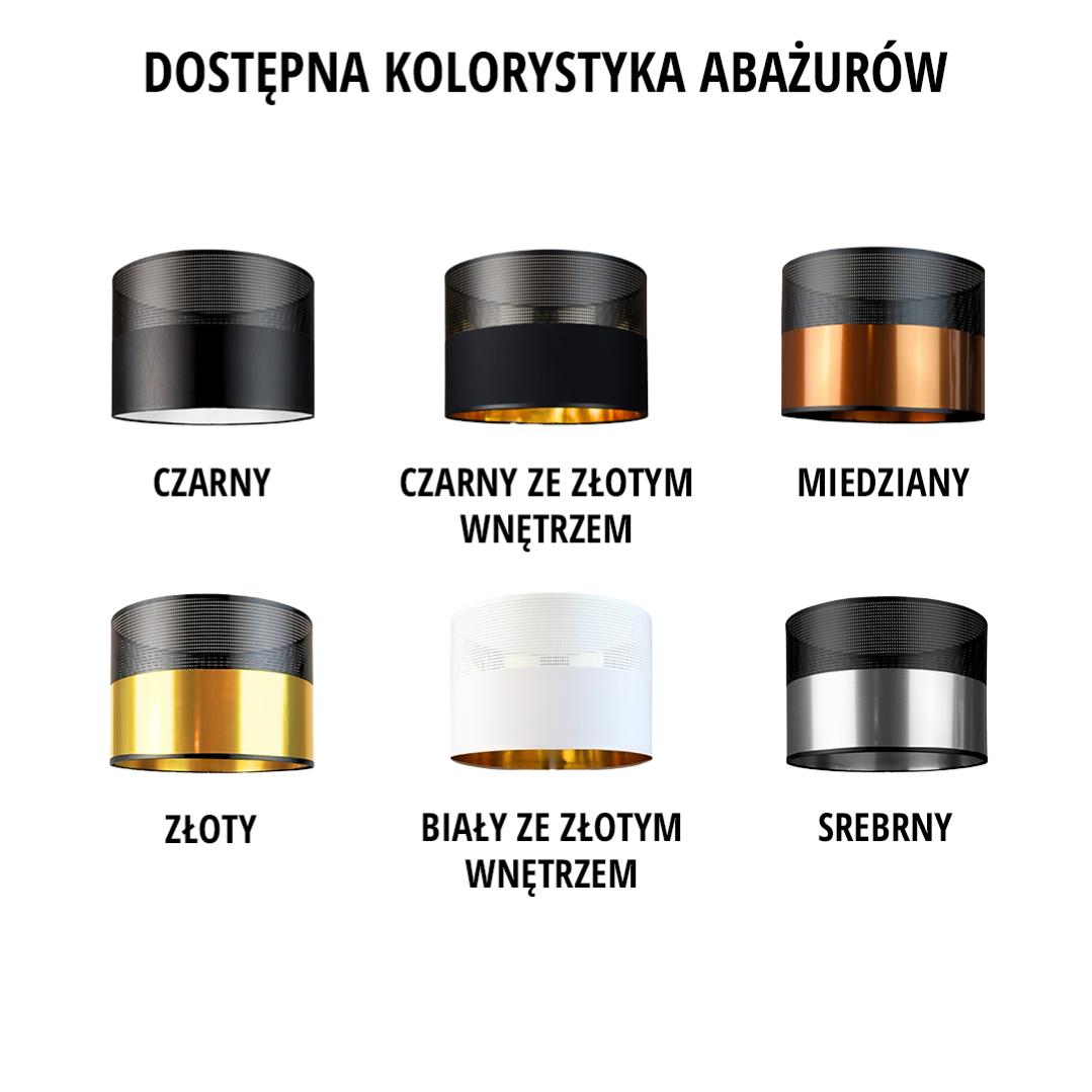 Kolor abażuru czarny z czarnym ażurem, czarny ze złotym wnętrzem z czarnym ażurem, biały ze złotym wnętrzem z ażurem, miedziany z czarnym ażurem, srebrny z czarnym ażurem, złoty z czarnym ażurem