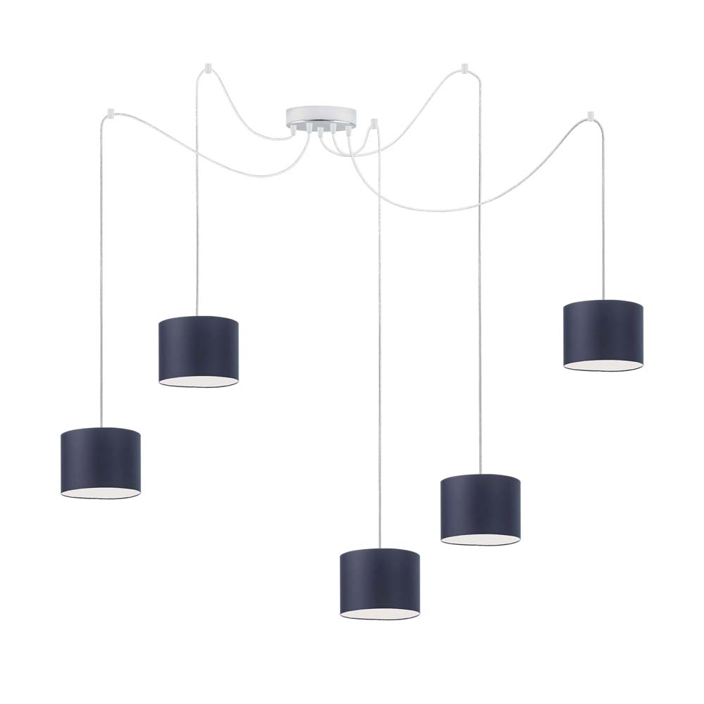 Nowoczesny żyrandol pająk WAIKIKI W5 ma pięć subtelnych (mierzących 12 cm wysokości i 17,5 cm szerokości) źródeł światła. Każdy klosz został wykonany z holenderskiej tkaniny tekstylnej podklejonej na folii PCV. Także i przy tym projekcie częstochowski producent designerskich lamp LYSNE.PL zadbał o szeroki wybór kolorów abażurów. W ofercie znajdują się odcienie takie jak: biały, ecru, jasny szary (gołębi), miętowy, musztardowy, jasny różowy, jasny fioletowy, beżowy, szary (stalowy), czerwony, niebieski, fioletowy, zieleń butelkowa, granatowy, grafitowy, brązowy, czarny oraz szary melanż (tzw. beton). Poza różnymi wersjami tkaniny, dostępnych jest również kilka kolorów stelaża — biały, chrom, czarny, stal szczotkowana, stare złoto. Zarówno szerokość, jak i długość lampy można regulować. Maksymalna długość każdego z przewodów wynosi 200 cm. Nowoczesny żyrandol pająk jest dostosowany do pięciu źródeł światła o klasach energetycznych od A do G. W tym modelu lampy możesz zainstalować różne żarówki – energooszczędne, LED lub tradycyjne o mocy maksymalnej 60W z tzw. „dużym gwintem” E27.