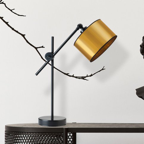 Czarna lampa nocna ze złotym kloszem MALI MIRROR to wyrazisty i stylowy dodatek do każdego wnętrza, który zachwyca prostotą i nowoczesnym designem. Lampa posiada solidny, czarny stelaż wykonany z metalu, który nadaje jej stabilność i elegancję. Jej wymiary są regulowane i wynoszą około 50 cm wysokości i 20 cm szerokości co sprawia, że jest idealna na biurko, stolik nocny lub sprawdzi się w roli lampki stołowej. Abażur wykonany z materiału PVC dostępny jest w dwóch eleganckich kolorach: złotym i miedzianym, co pozwala na dopasowanie lampy do różnych aranżacji wnętrzarskich.