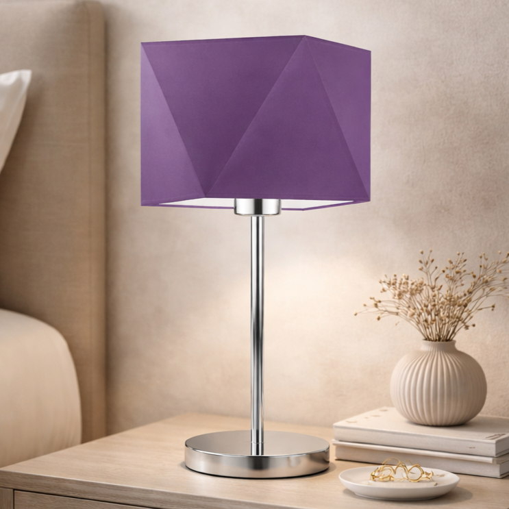 Lampka nocna WUHU od LYSNE.PL — polskiego producenta designerskich lamp z abażurami — wyróżnia się prostą, a jednocześnie bardzo elegancką formą. Składa się ze stabilnego, metalowego stelaża z okrągłą podstawą i klosza z holenderskiej tkaniny tekstylnej, który powstał z inspiracji strukturą diamentu. Materiałowy abażur ma 23-centymetrową przekątną i 16 cm wysokości. Lampka nocna z fioletowym abażurem o szerokości 23 cm, w pionie mierzy 43 cm. Dzięki dostępności różnych kolorów klosza (biały, ecru, jasny szary (gołębi), miętowy, musztardowy, jasny różowy, jasny fioletowy, beżowy, szary stalowy, czerwony, niebieski, fioletowy, zieleń butelkowa, granatowy, grafitowy, brązowy, czarny oraz szary melanż (tzw. beton)) oraz sześciu rodzajów powłok stelaża — srebrny, biały, czarny (w standardzie), chrom, stal szczotkowana, stare złoto (wariant dodatkowo płatny), możesz stać się projektantem we własnym domu! Mieszaj kolory i korzystaj z naszych inspiracji! Nowoczesna lampka na stolik nocny z abażurem WUHU jest dostosowana do żarówek z tzw. dużym gwintem (E27) o maksymalnej mocy 60W. Pasują do niej zarówno żarówki LED, jak i źródła światła o klasach energetycznych od A do G. Producent zapewnia 24-miesięczny okres gwarancji na lampkę nocną WUHU.