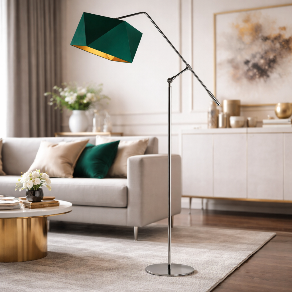 Odkryj fascynujący świat oświetlenia z lampą podłogową na wysięgniku. COLMA to niezwykłe źródło światła, które nie tylko rozświetli Twoje pomieszczenie, ale również wprowadzi do niego nutę elegancji. Abażurowa lampa stojąca emanuje przyjemnym światłem, kształtując przy tym przestrzeń wokół siebie odbijając złote refleksy. To coś więcej niż lampa — to prawdziwe dzieło sztuki użytkowej. Funkcjonalna konstrukcja oprawy przykuwa uwagę swoim minimalizmem zyskując jednocześnie przy bliższym poznaniu. Na szczególną uwagę zasługuje klosz lampy przypominający formą diament. Wykonany z holenderskiej tkaniny tekstylnej podklejony złotą amplą, by jeszcze piękniej elegancka lampa stojąca prezentowała się we wnętrzu. Konstrukcja COLMY przykuwa uwagę swoją prostotą, a jednocześnie zyskuje charakter dzięki designerskiemu abażurowi. Regulowane ramię, minimalistyczna podstawa i oryginalny kształt klosza łączą się, tworząc harmonijną kompozycję z nutą współczesnego stylu.