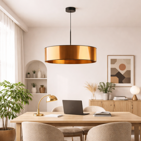 Najbardziej charakterystycznym elementem wiszącej lampy glamour SINTRA MIRROR jest cylindryczny abażur o średnicy 60 cm i wysokości 20 cm wykonany z połyskującego, miedzianego materiału PVC o efekcie lustra. Klosz pięknie odbija światło nadając wnętrzu ciepły, elegancki blask. Dzięki prostej formie abażurowa lampa wisząca SINTRA doskonale wpisuje się w różne style aranżacyjne – od nowoczesnych i loftowych po bardziej klasyczne. Z powodzeniem sprawdzi się jako lampa wisząca do salonu, nowoczesny żyrandol do sypialni czy stylowe oświetlenie kuchenne.