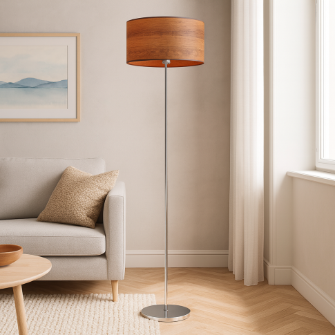 Oświetlenie podłogowe WERONA z kolekcji ECO producenta oświetlenia LYSNE.PL to klasyczna lampa stojąca, która prostotą wpasuje się w wiele stylów wnętrzarskich. Minimalistyczna nóżka dostępna w kilku wariantach kolorystycznych (biały, srebrny, czarny, chrom, stal szczotkowana, stare złoto) i cylindryczny abażur o średnicy 40 cm wykonany z materiału przypominającego strukturę drewna barwionego na kilka kolorów (orzechowy, dąb sonoma oraz kasztanowy) tworzą połączenie idealne. Światło wydobywające się spod designerskiego klosza jest miękkie i przytulne, rozchodzi się na całą powierzchnię wnętrza tworząc odprężającą atmosferę. A la fornirowe abażury wpisują się w styl skandynawski tworząc naturalne i przytulne wnętrze, pełne spokoju i prostoty.
