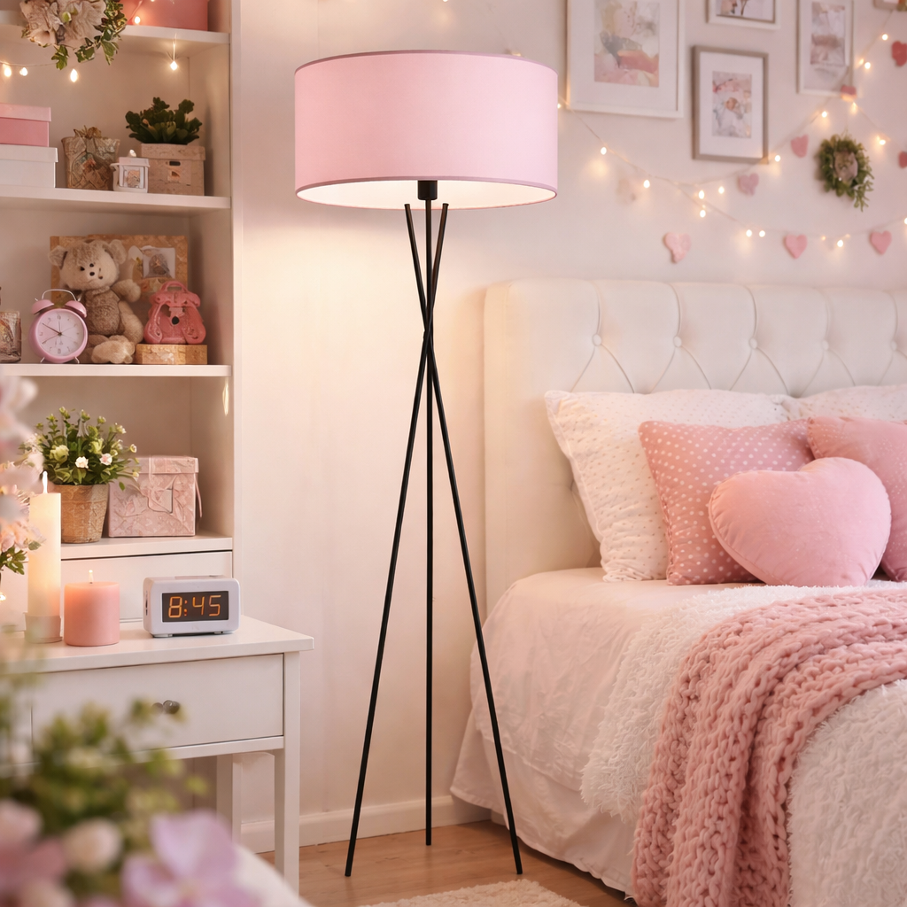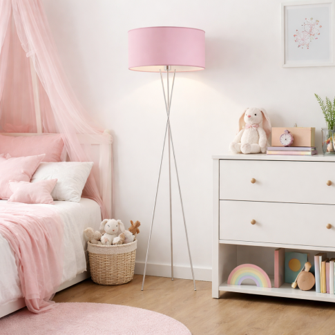 Nowoczesna lampa podłogowa do pokoju dziecięcego na 3 nogach PARYŻ z różowym abażurem