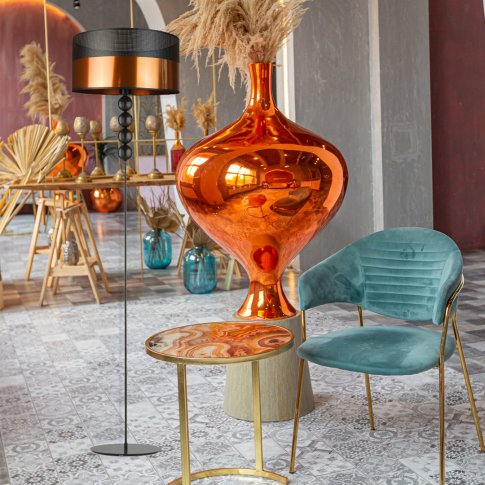 Czarna lampa podłogowa do salonu BERMUDY GLAM to idealne rozwiązanie dla tych, którzy poszukują oświetlenia łączącego funkcjonalność z efektownym designem. Świetnie sprawdzi się jako elegancka lampa podłogowa w salonie, gdzie jej światło stworzy przytulną atmosferę podczas wieczornego relaksu. Ustawiona obok aksamitnej sofy lub marmurowego stolika kawowego doda wnętrzu szczypty hollywoodzkiego splendoru. Z kolei w przestrzeniach industrialnych jej metalowy stelaż i geometryczne kształty będą idealnie współgrać z surowym betonem, cegłą i minimalistycznym wystrojem. Ta wszechstronność sprawia, że miedziano-czarna lampa stojąca BERMUDY GLAM doskonale odnajdzie się w domowych wnętrzach, ekskluzywnych butikach, stylowych hotelach czy prestiżowych biurach.